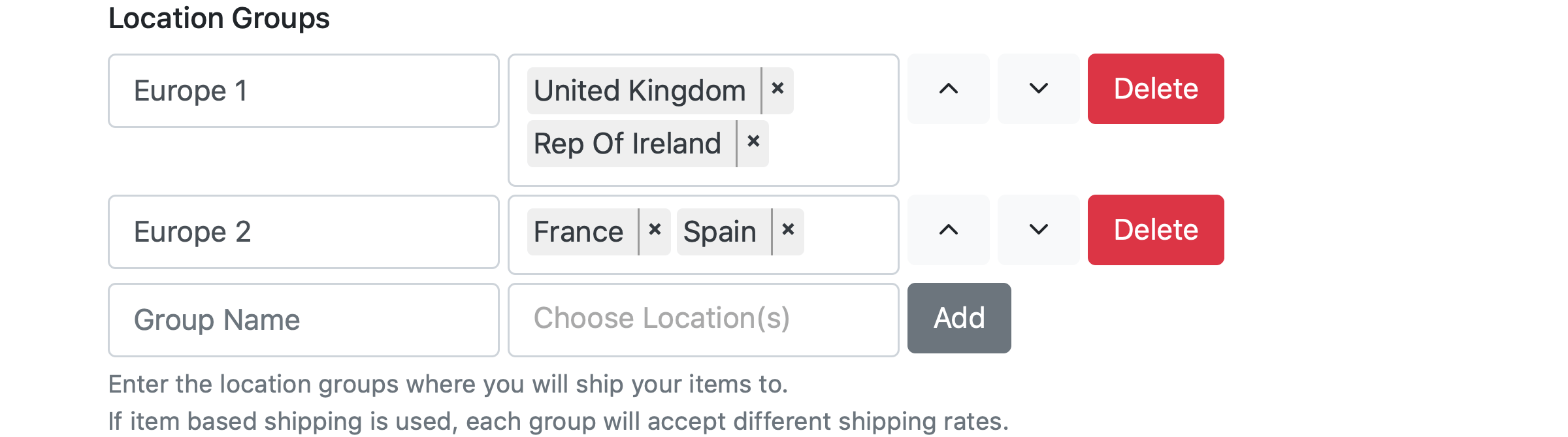 Two location groups Europe1 (United Kingdom, Ireland) and Europe2 (France, Spain) with two different different shipping rates.